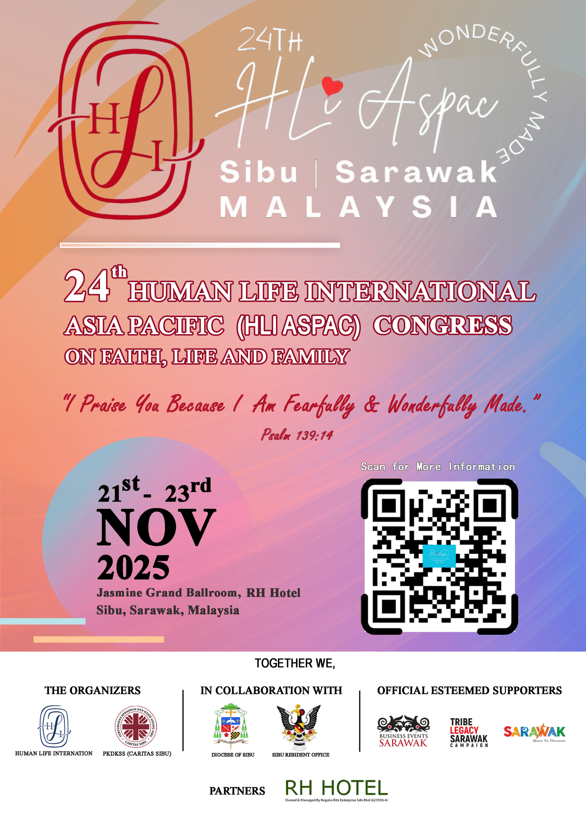 Hosted by Human Life International (HLI) and PKDKSS (Caritas Sibu), in collaboration with the Diocese of Sibu and the Sibu Resident Office, this 24th HLI ASPAC Congress brings together global leaders, believers of different faith working in the public and private sectors, and advocates dedicated to promoting and protecting the sanctity of human life, the dignity of family and the strength of faith in today’s world.