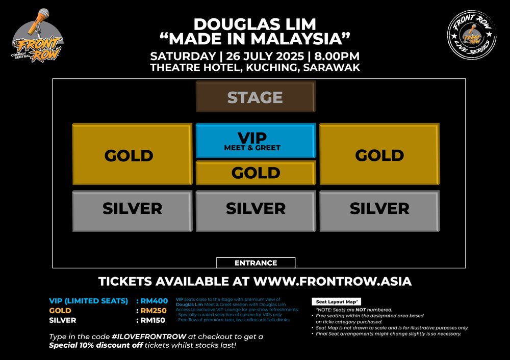 Front Row Asia, as part of their LIVE SERIES, is kicking off their Front Row Comedy Sentral platform with Douglas Lim – Made in Malaysia coming to Miri and Kuching‼️ 👏🏽🎉