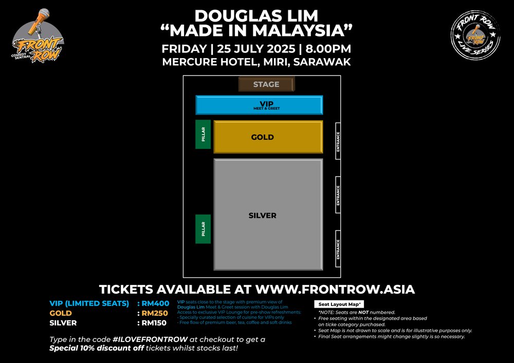 Front Row is thrilled to bring the tour to Sarawak. Don’t miss this chance to catch him live in Miri on 25th July 2025 and Kuching on 26th July 2025. Experience his wit and comedic observations as he brings the LOLs to you live on stage. 🎤🤡🤣🤣